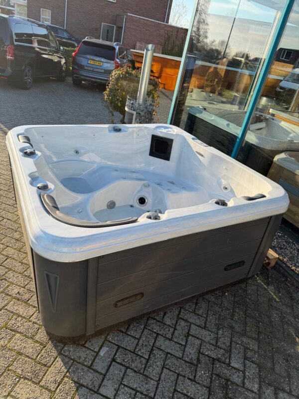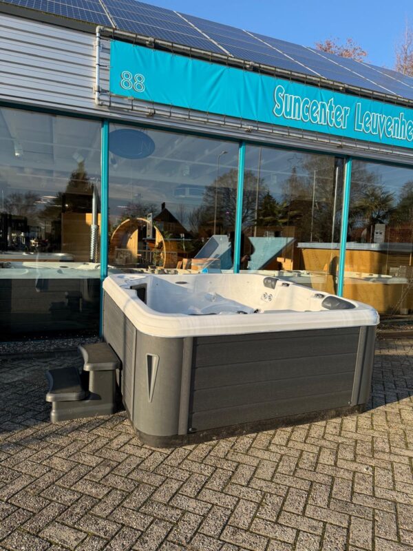 De afmeting van de spa is 1.95 x 1.95 m en hij is voorzien van comfortabele lig- en zitplaatsen, krachtige massagejets en een modern bedieningspaneel voor ultiem gebruiksgemak. Dankzij het tijdloze design past hij perfect in iedere tuin of wellnessruimte.